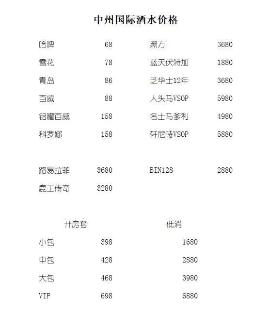 - 洋酒套餐:多款经典品牌,加软饮无限续杯。