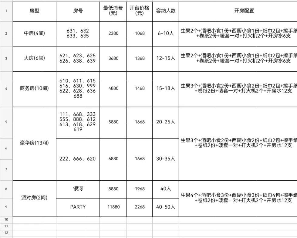 - 大房:宽阔视野,配备独立吧台,团建首选。