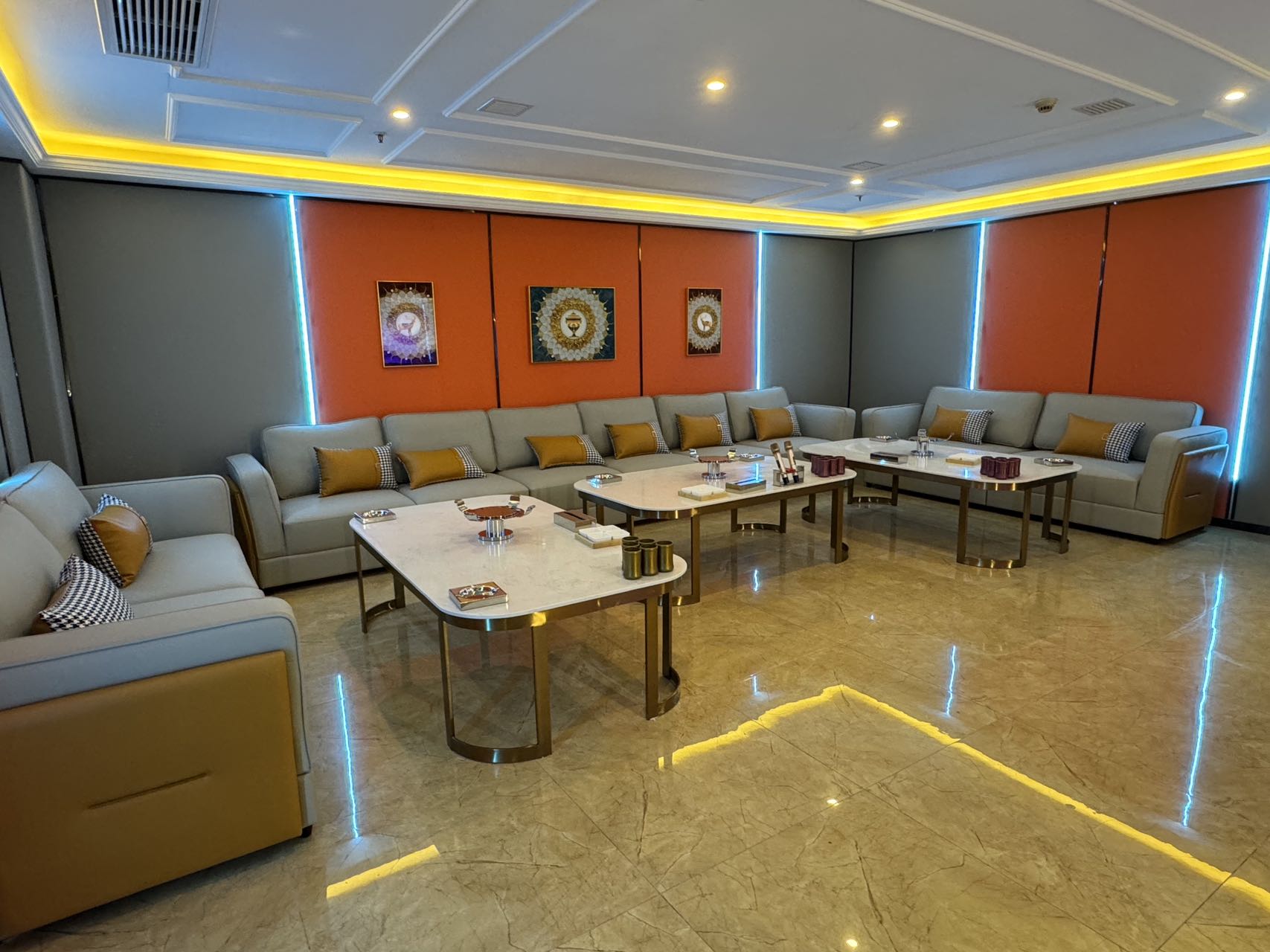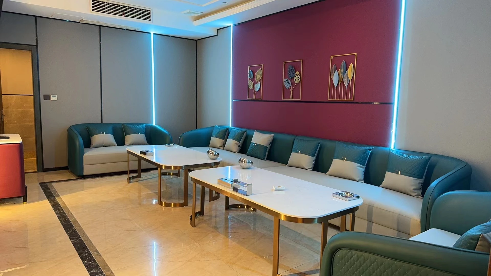 步入包厢,极简线条与柔光灯带交织出未来感氛围。高背真皮沙发环绕大理石茶几,中央触控屏可随心切换场景灯效。无论是小型洽商还是十余人团建,都能按需匹配空间,真正实现“包厢即私邸”。