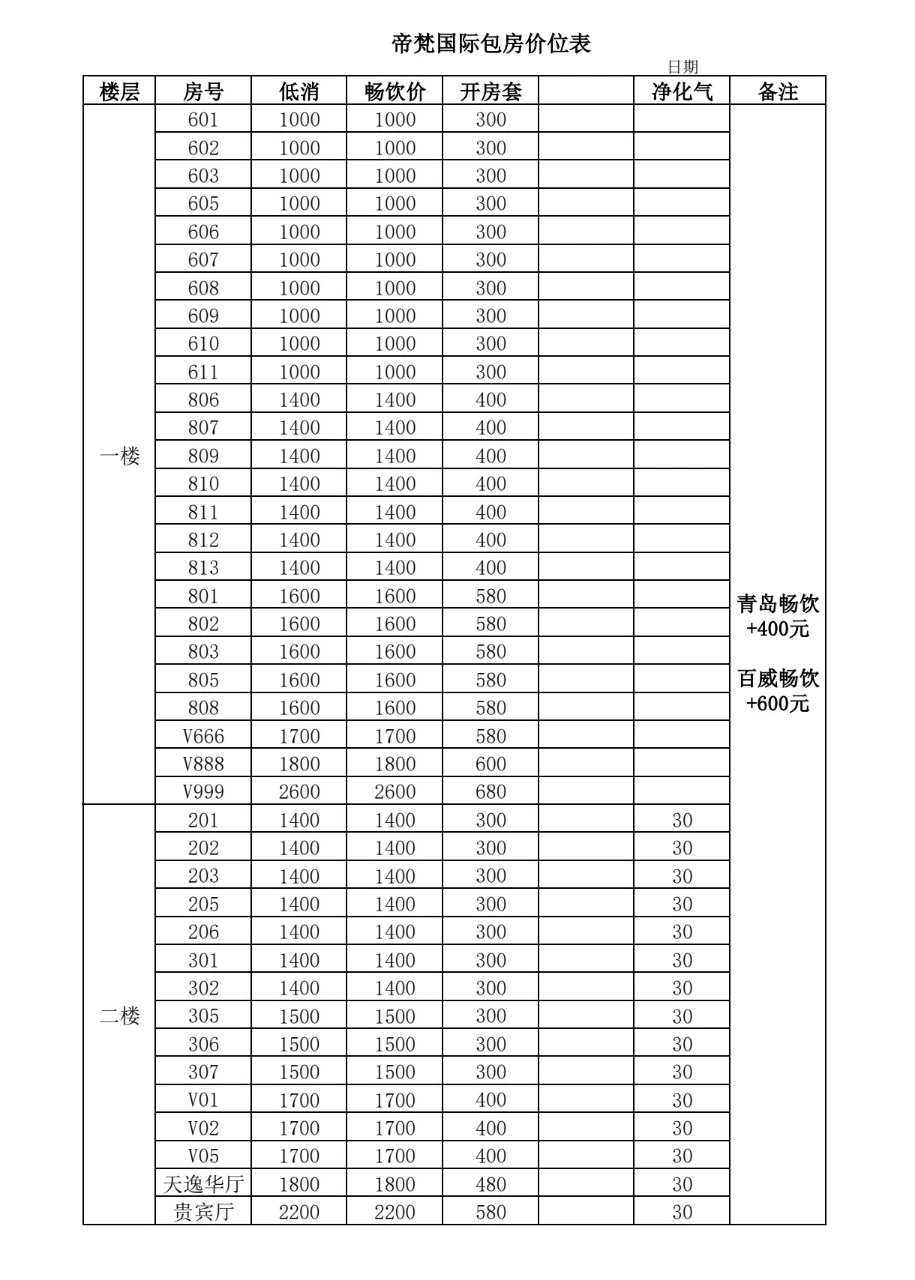 帝梵国际共设十余间风格迥异的包厢,从小型私享到超大派对场一应俱全。小型房可灵活选择仅配少爷服务,200即可体验专业点单、调酒与气氛营造;若需gong主互动,则按400/600标准配置,确保每位来宾都尽兴。