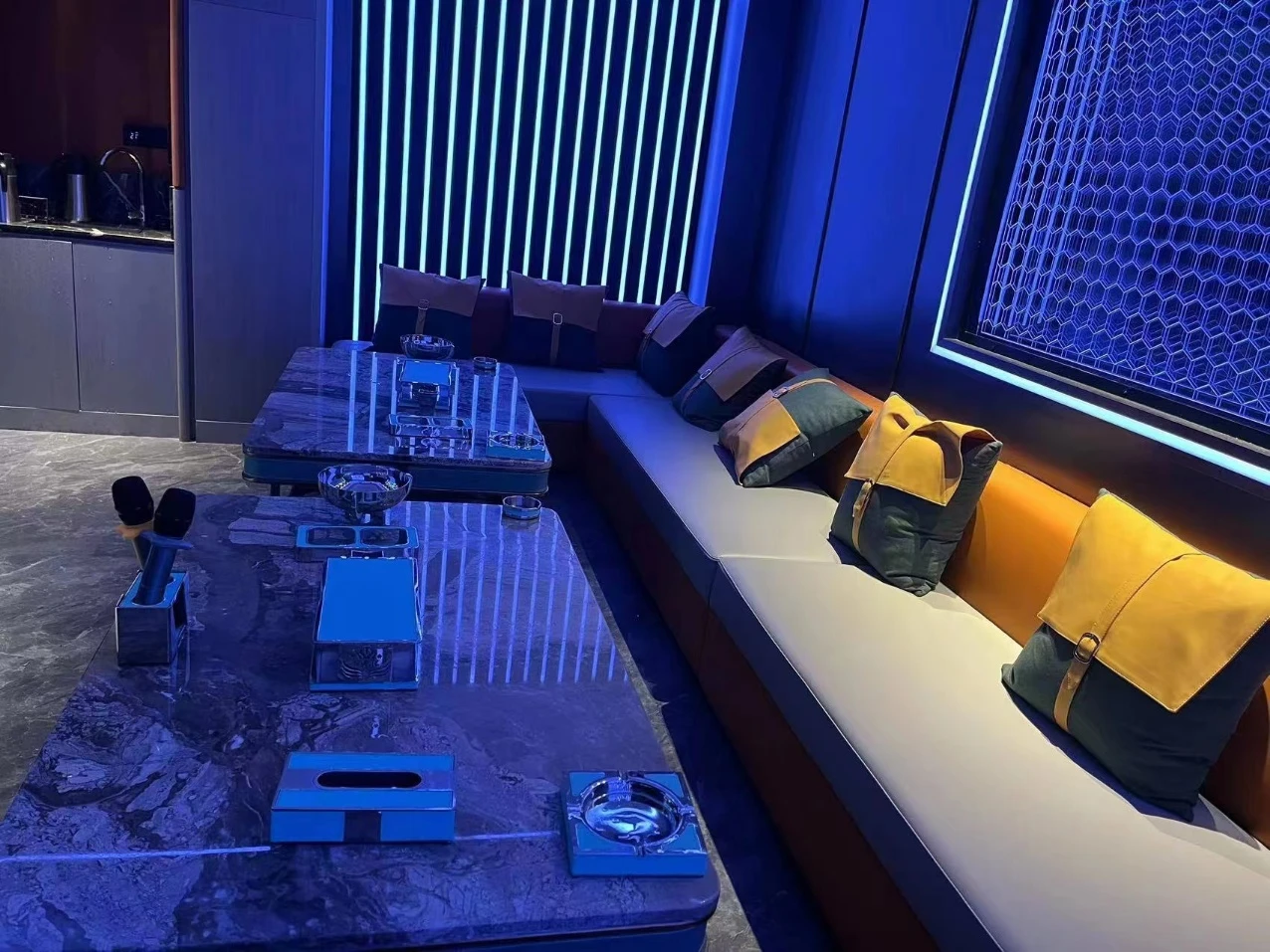 每间包厢配备进口触控屏点歌台、无线麦、智能灯光,轻轻一滑即可切换泳池蓝、迷幻紫、热情红等多种场景模式。部分房型自带小型舞池与独立吧台,适合生日趴或庆功宴。