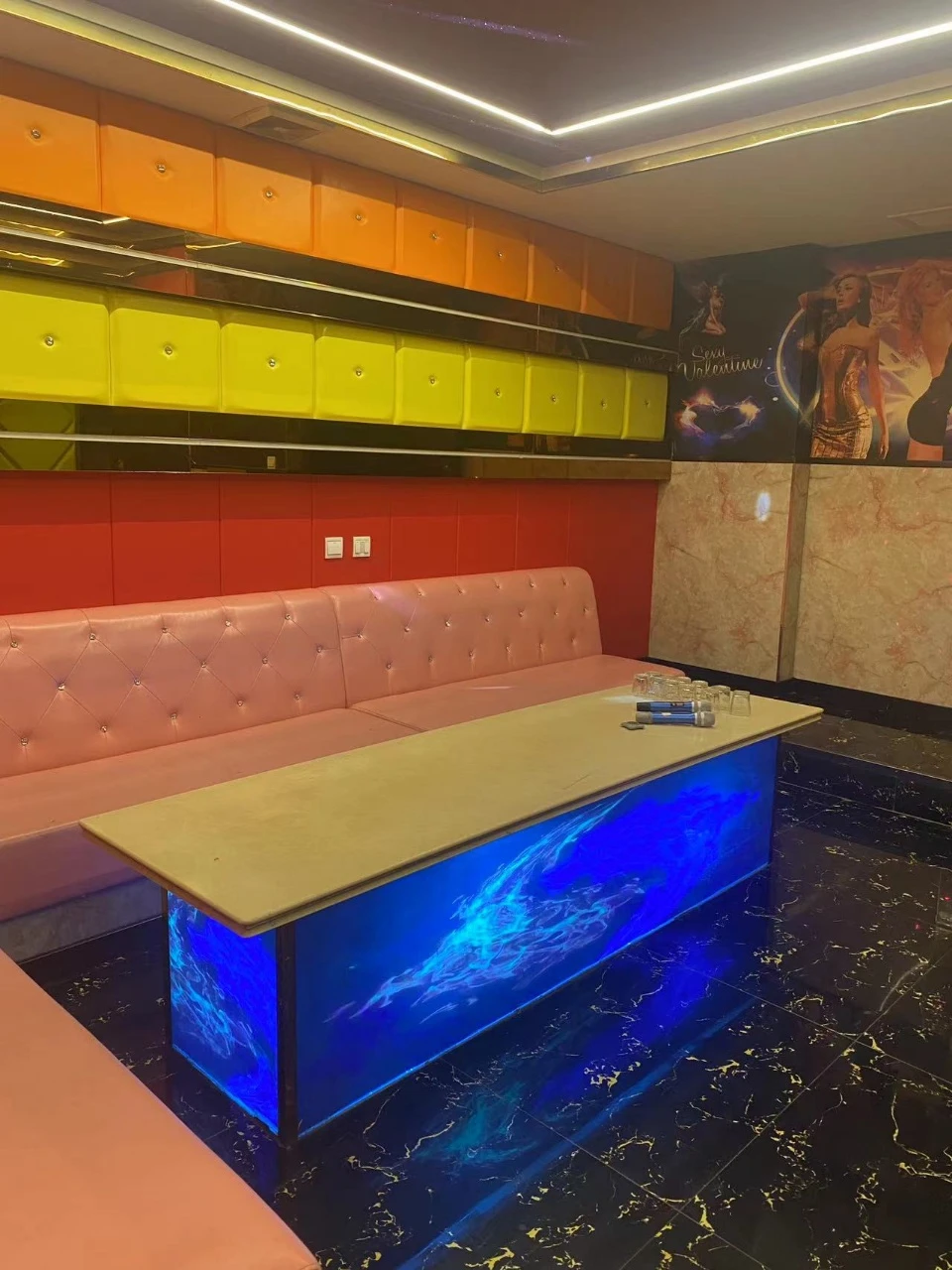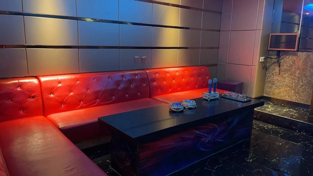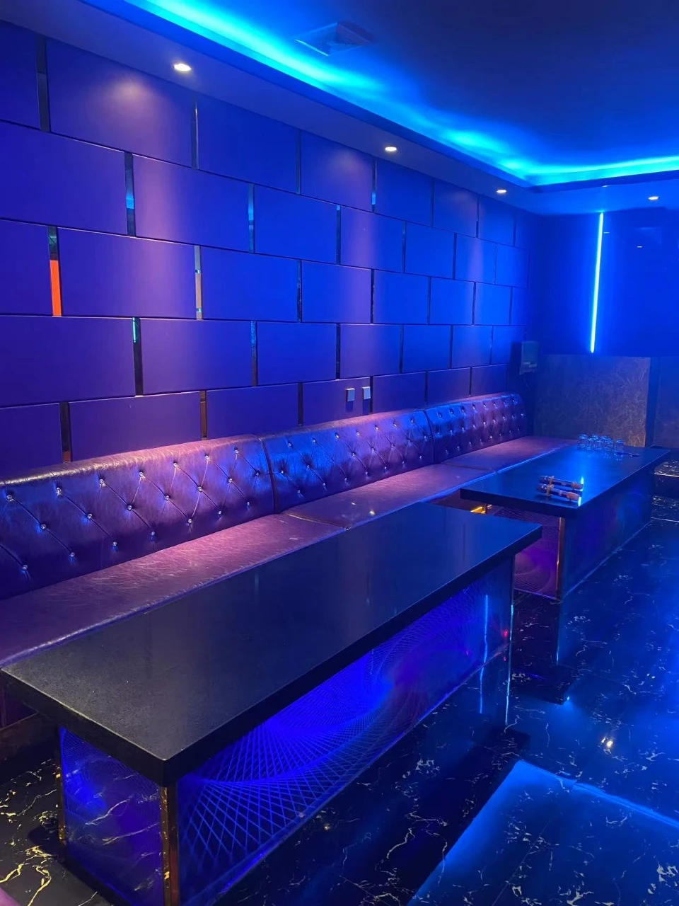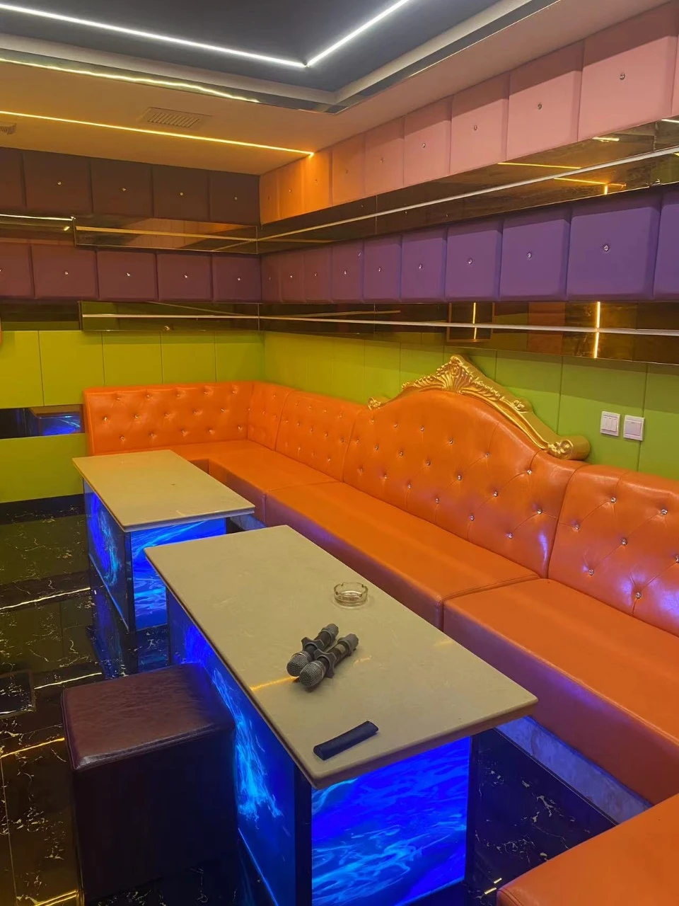 包厢内部空间开阔,皮质沙发环抱式布局,中央大理石桌摆满果盘与小吃。灯光可随心切换,暖黄、炫彩、动感,氛围一把拿捏。